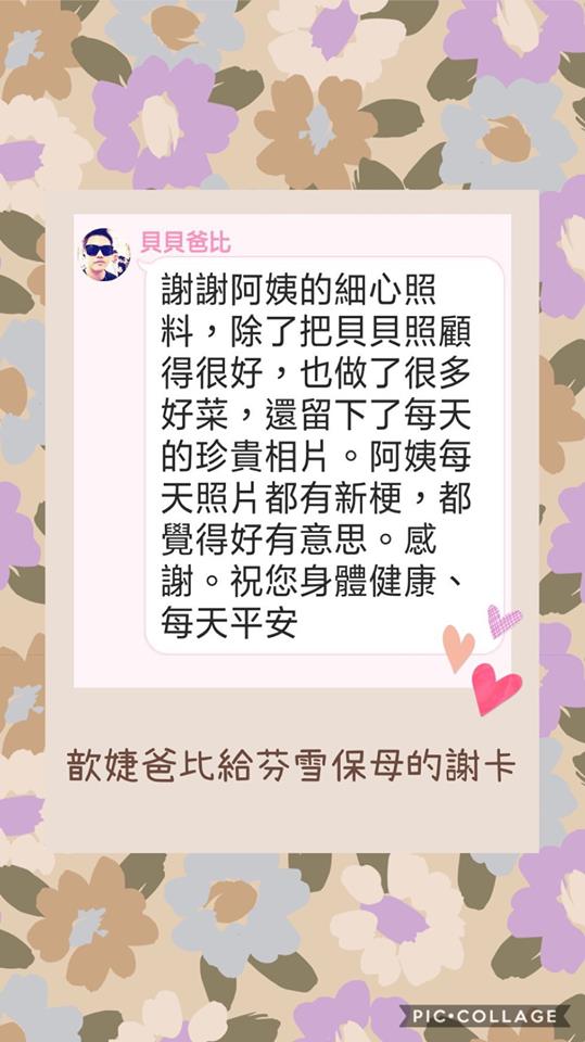 謝謝阿姨的細心照料,除了把貝貝照顧得很好,也做了很多好菜,還留下了每天珍貴相片。