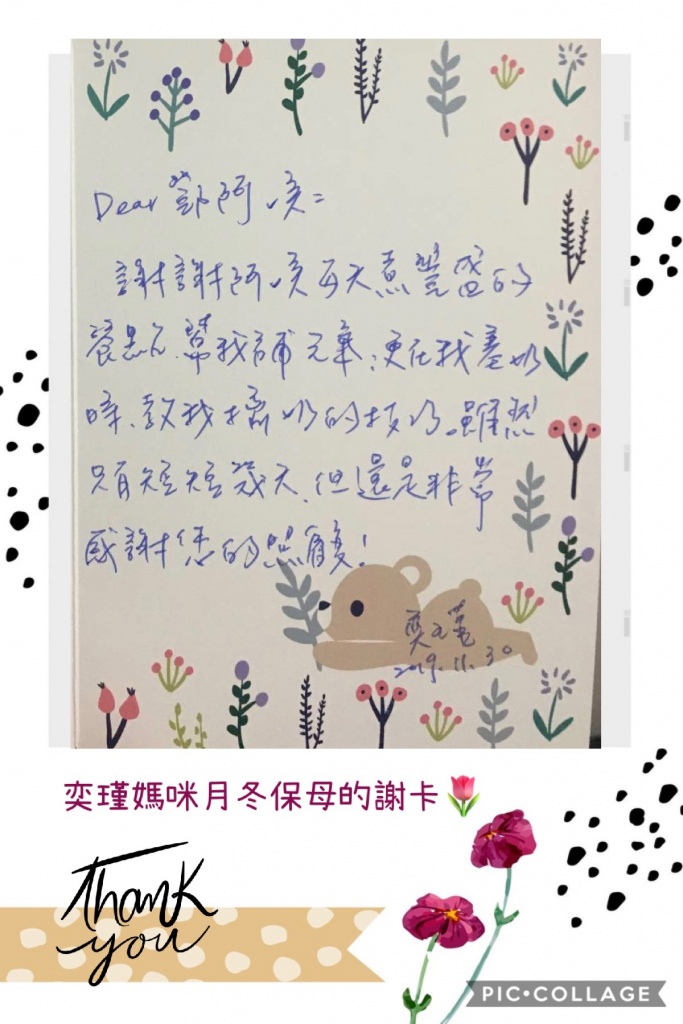 客戶好評 by Naturalmammy_usr 2020 年 8 月 29 日 Dear 鄧阿姨 謝謝阿姨每天煮豐盛的餐點幫我補元氣,更在我餵奶時教我擠奶的技巧。雖然只有短短幾天,但還是非常感謝您的照顧! 奕瑾 2019.11.30
