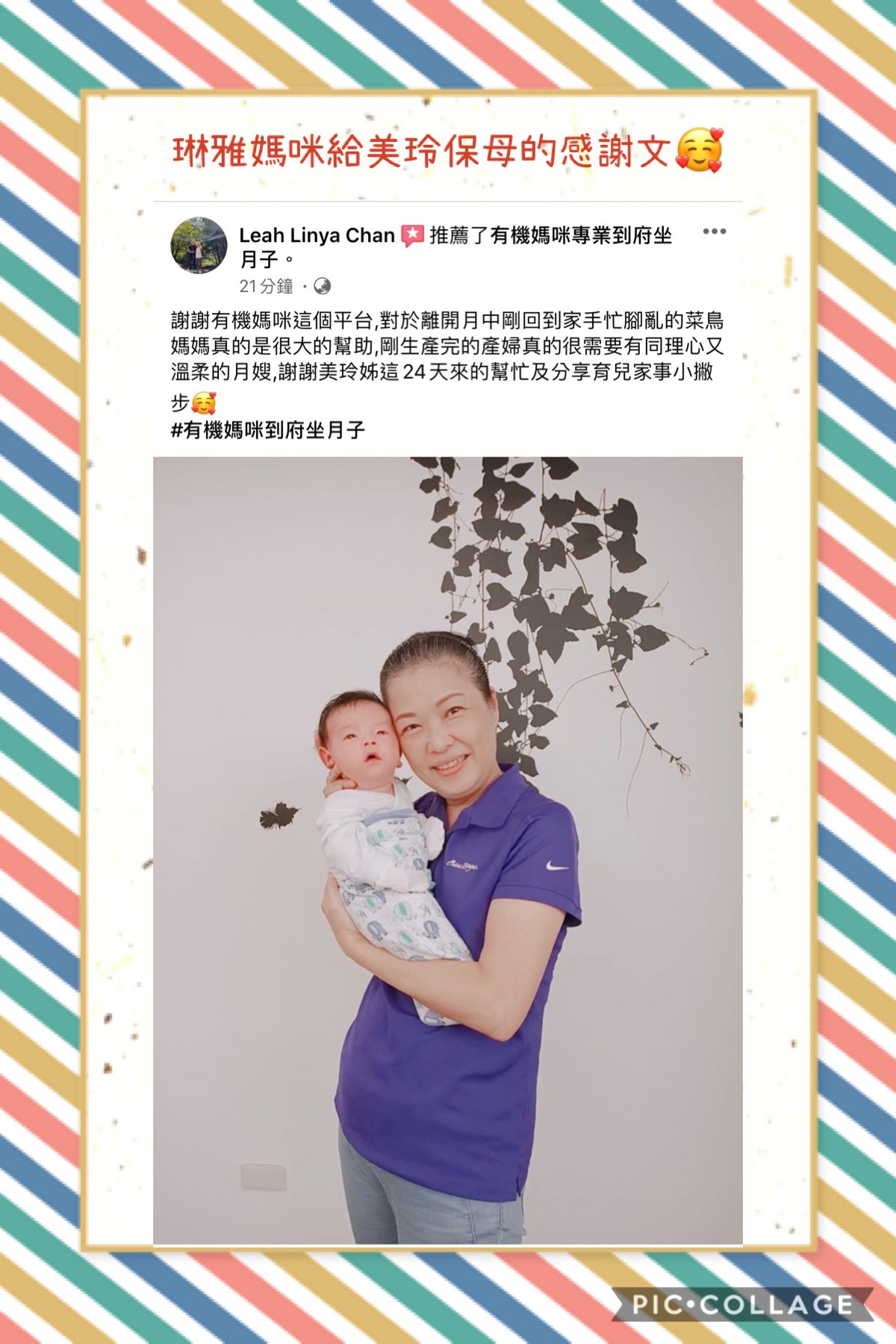 客戶好評 by Naturalmammy_usr 2020 年 11 月 8 日 謝謝有機媽咪這個平台,對於離開月中剛回到家手忙腳亂的菜鳥媽媽真的是很大的幫助,剛生產完的產婦真的很需要有同理心又溫柔的月嫂,謝謝美玲姊這24天來的幫忙及分享育兒家事小撇步