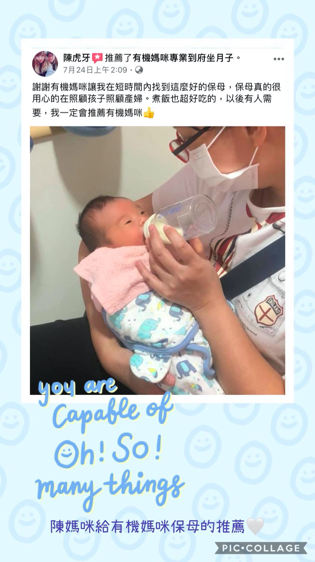 客戶好評 by Naturalmammy_usr 2021 年 4 月 10 日 謝謝有機媽咪讓我在短時間內找到這麼好的保母,保母真的很用心在照顧孩子照顧產婦。煮飯也超好吃的,以後有人需要,我一定會推薦有機媽咪!